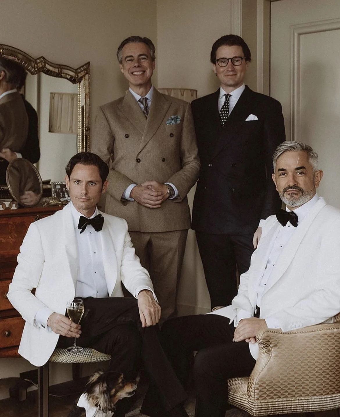 Uw tailors Menno en Melvin samen met Couturier Edwin Oudshoorn en zijn echtgenoot Nick poserend voor hun huwelijksvoltrekking in The Boardroom Amsterdam smokings | Fotocredits: Divine Day Potography | Locatie: Hotel L’europe Amsterdam